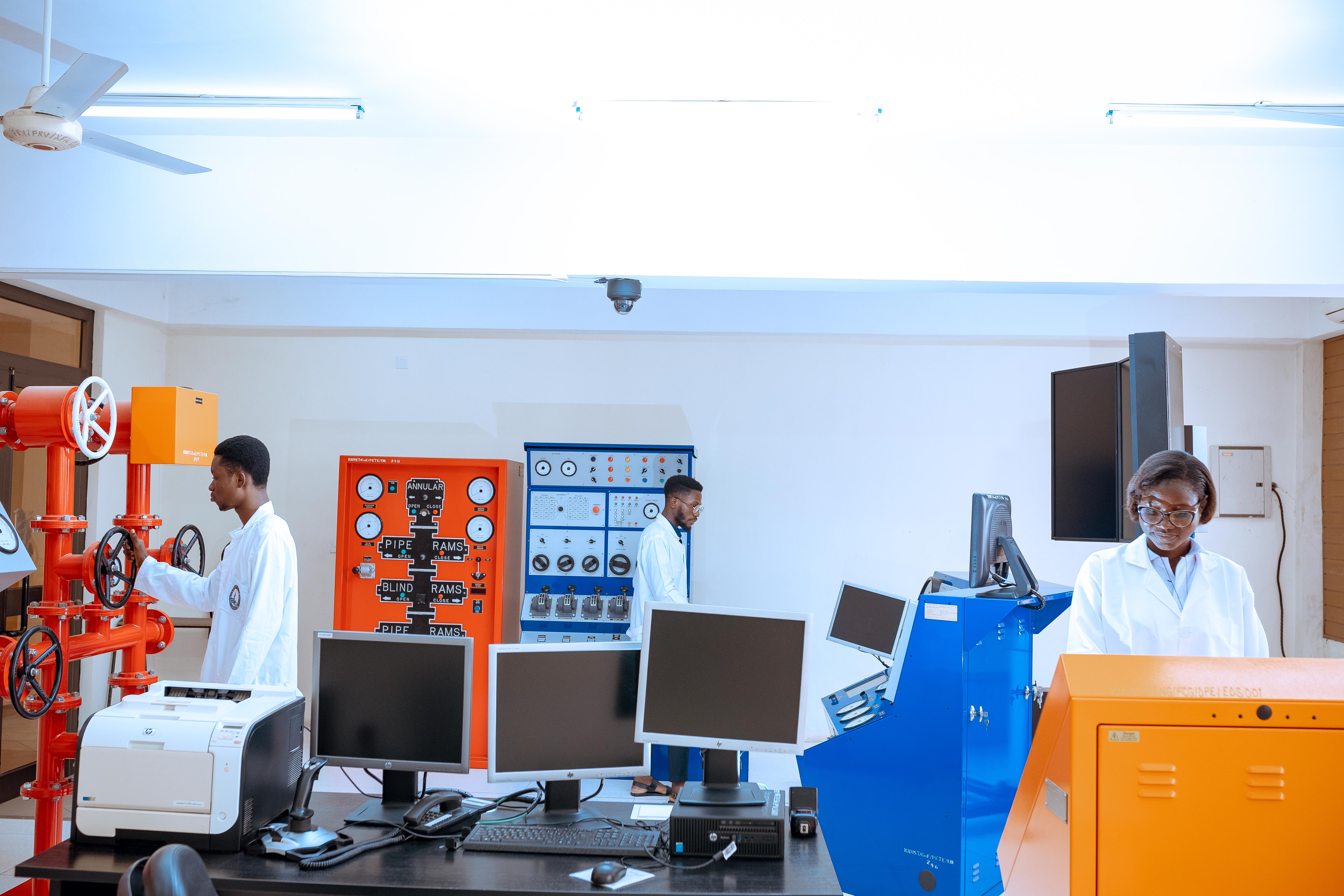 The Drilling and Well Control Simulation Laboratory has a full-size Derrick Floor Drilling Simulator (DRILLSim 5000), which can be used to train individuals on the various operations that go on during oil-well drilling. The Simulator satisfies requirement for training in oil-well drilling operations such as Well Intervention, Pressure Control, Coil Tubing, etc. certifiable by the International Well Control Forum (IWCF) and the International Association of Drilling Contractors (IADC).